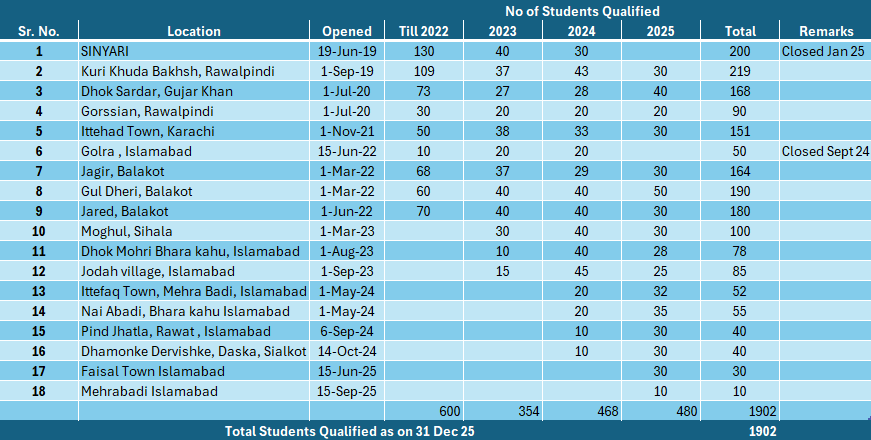 First course was conducted in September 2020 at Naval Anchorage, Islamabad. Thereafter courses were conducted by eNexusMedia / QuinceIT through a joint venture with Baadbaan Welfare Trust. A Computer Literacy Centre operated in Village Ranjali, Gujar Khan from 20 Dec 23 to 30 Oct 24, wherein 25 female students attended Course on MS Office.
